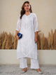 Muslin Chikankari kurti, adorned with traditional Bakhiya embroidery and shimmering Mukaish work. A timeless piece that beautifully blends heritage with modern style. Perfect for Festive season.