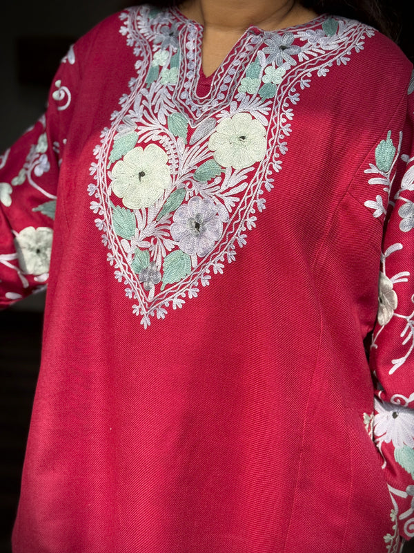 Highlights: Intricately crafted woolan Phiran with Aari embroidery